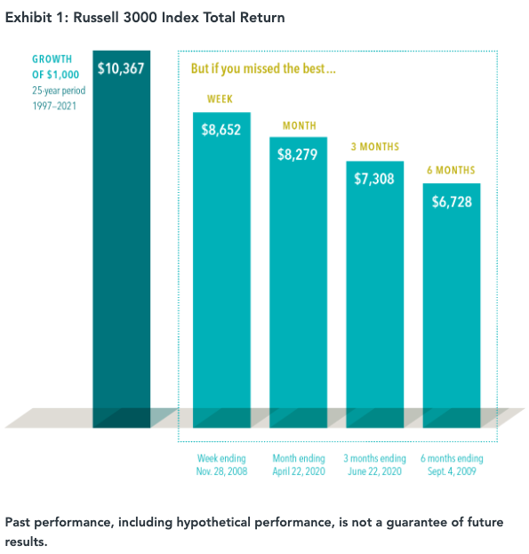 A hypothetical $1,000 investment made in 1997 turns into $10,367 for the 25-year period ending December 31, 2021. Over that same period, if you miss the Russell 3000’s best week, which ended November 28, 2008, the value shrinks to $8,652. Miss the three best months, which ended June 22, 2020, and the total return dwindles to $7,308.